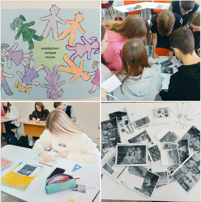 Сегодня в нашей школе обучающиеся 9-го класса приняли участие в познавательном мероприятии «Калейдоскоп народов России». Ребята окунулись в удивительный мир культур и традиций многонациональной России: они познакомились с особенностями национальных костюмов и блюдами национальной кухни, услышали мелодичные народные напевы и оформили плакат, символизирующий единство народов России.